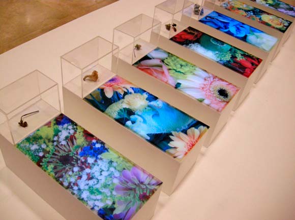 Photograph, dry flowers, wood, acrylic, light, sound.