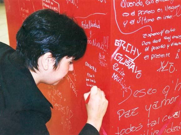 The work opened a space to the client inside and outside the shop making him participate. Apart from the object, the behaviour that it generated was also important here. The proposal to express a Christmas wish by writing is a way of materializing it, of making it real in the text. Thus, the work attempted to rescue those personal wishes in a space of freedom, since they are generally conditioned by advertising.