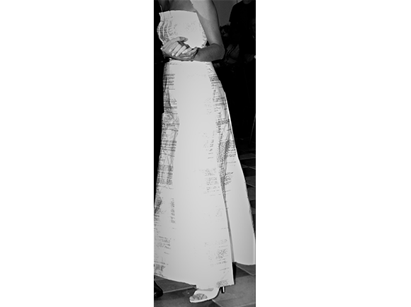 “Wedding Dress” represents a paper dress with printed texts. The piece takes the paper material as a symbolic axis for a real-time performance that took place at a real wedding.