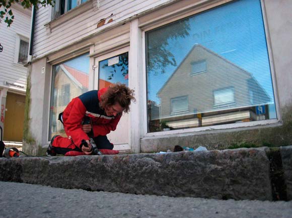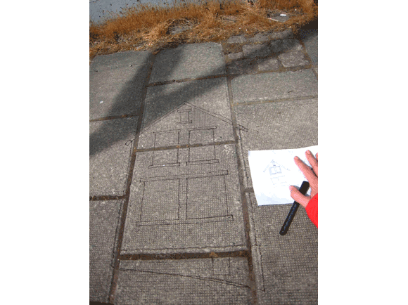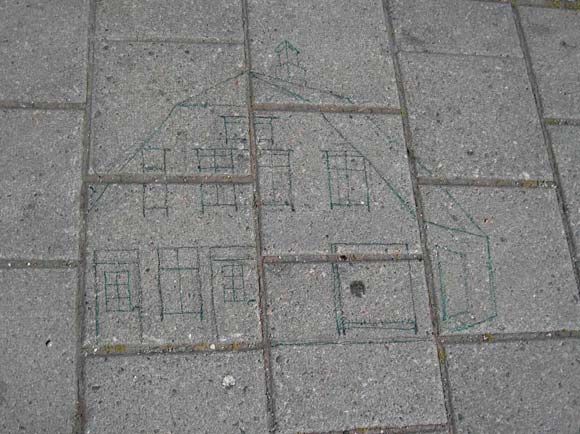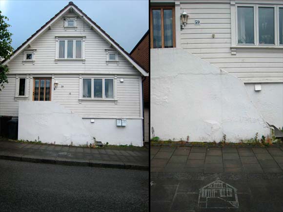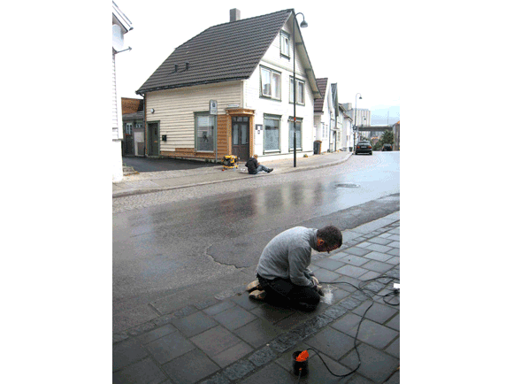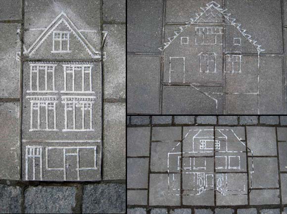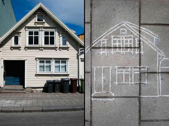 This project was selected in a public competition for the public art event that took place in the city of Stavanger, Norway. On the occasion it was declared "Culture European City 2008". This project was chosen with other seven projects, to be developed along the Pedersgata street, which joins the downtown with the coast. It proposed to capture a part of the architecture of this site through a displacement to the drawing and a change of scale. The plan was to interfere in the reality with a fantasy language. The work made itself place in the paths of this street in the city. Simplified linear silhouettes of the facade of certain architectural constructions were engraved in front of their entrances.