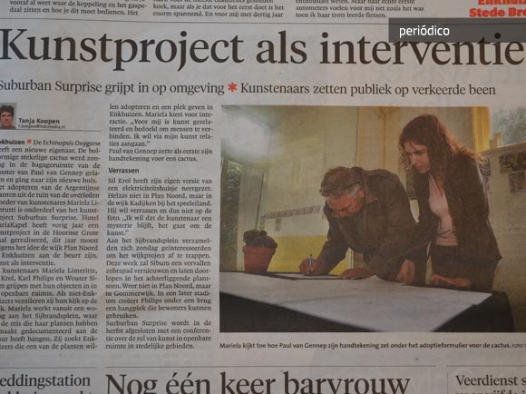 La búsqueda de los padres adoptivos se fue definiendo en el transcurso de la residencia para culminar en un evento público donde se entregaron las plantas y se expusieron el registro fotográfico del proceso de preparación, viaje y lugar de origen; las certificaciones, los permisos de viaje y los contratos de adopción firmados por los organizadores del evento, cada persona que asumió el compromiso de vivir con una de las plantas y por la autora. El proyecto fue cubierto por el periódico Noord-Hollands Dagblad en varios episodios.